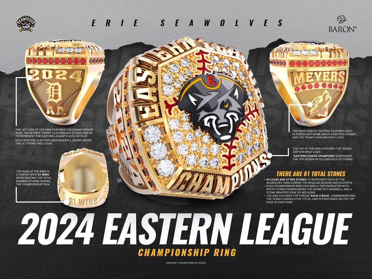 Discover the story behind the 2024 Erie SeaWolves Eastern League Championship Ring designed and manufactured by Baron® Championship Rings, featuring 81 stones for each win, custom design details, and a tribute to their back-to-back titles.