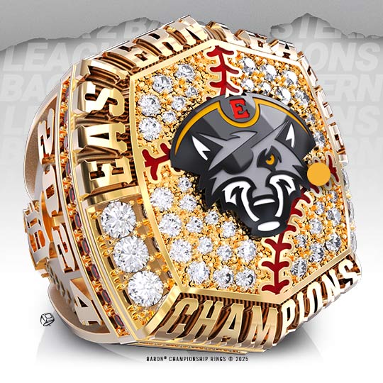 Atop the ring sits the team’s Captain Wolf logo, surrounded by white stones forming the seams of a baseball, and a red stone edge. The bold words “EASTERN LEAGUE CHAMPIONS” gleam in yellow gold.