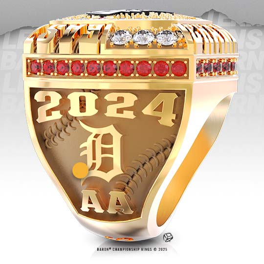 - The left side of the ring features the Championship year, the Detroit Tiger’s Olde English D logo, and AA to represent the Eastern League’s level of play.