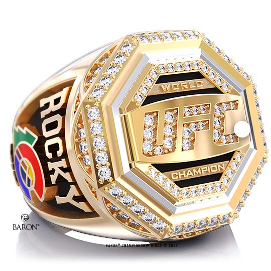 - The encrusted ring top holds the UFC logo with sparkling diamonds and is framed by the prestigious “World Champion” title wordmarks.