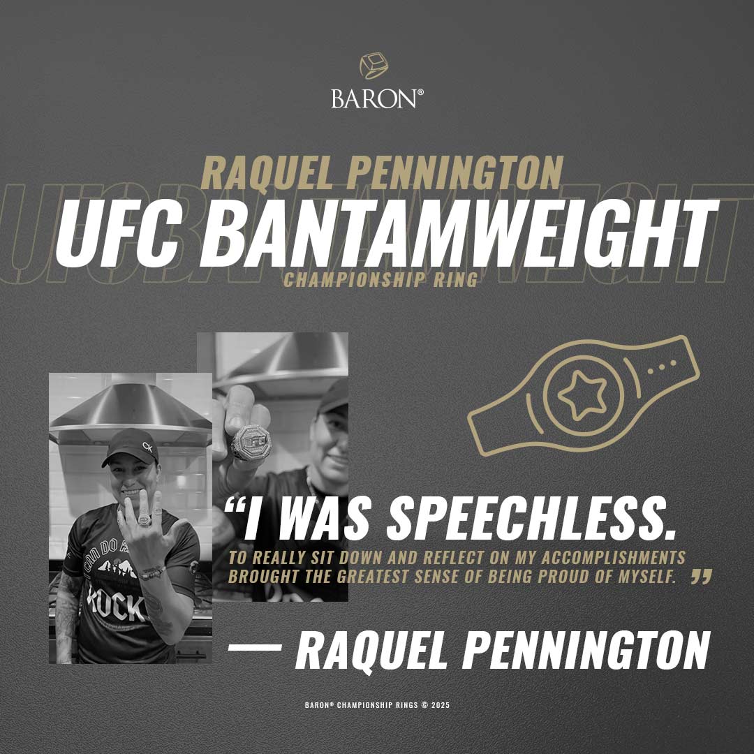 Experience the journey of UFC Bantamweight Champion Raquel Pennington and the creation of her MMA Championship Ring by Baron® Championship Rings. From her hard-fought victory at UFC 297 to exclusive insights on her career, resilience, and legacy—discover the story behind the champion and her one-of-a-kind MMA Championship Ring.