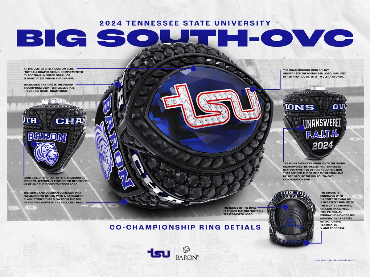 • More than a piece of jewelry, the 2024 Tennessee State University Big South-OVC Co-Championship Ring is a lasting symbol of perseverance, pride, and legacy.