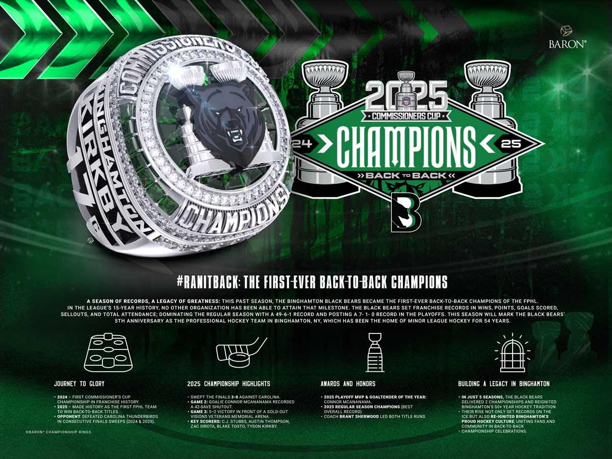 2025 Binghamton Black Bears Commissioner’s Cup Championship Ring by Baron® Championship Rings | The Binghamton Black Bears’ 2025 FPHL Commissioner’s Cup Championship Journey